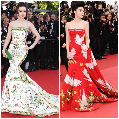 Hai chiếc váy gây ấn tượng đặc biệt trên thảm đỏ. Chiếc váy thêu tứ đại mỹ nhân Trung Quốc tinh tế trên từng đường kim mũi chỉ, trong khi chiếc đầm đỏ giúp Phạm Băng Băng nổi bật với họa tiết chim trắng.